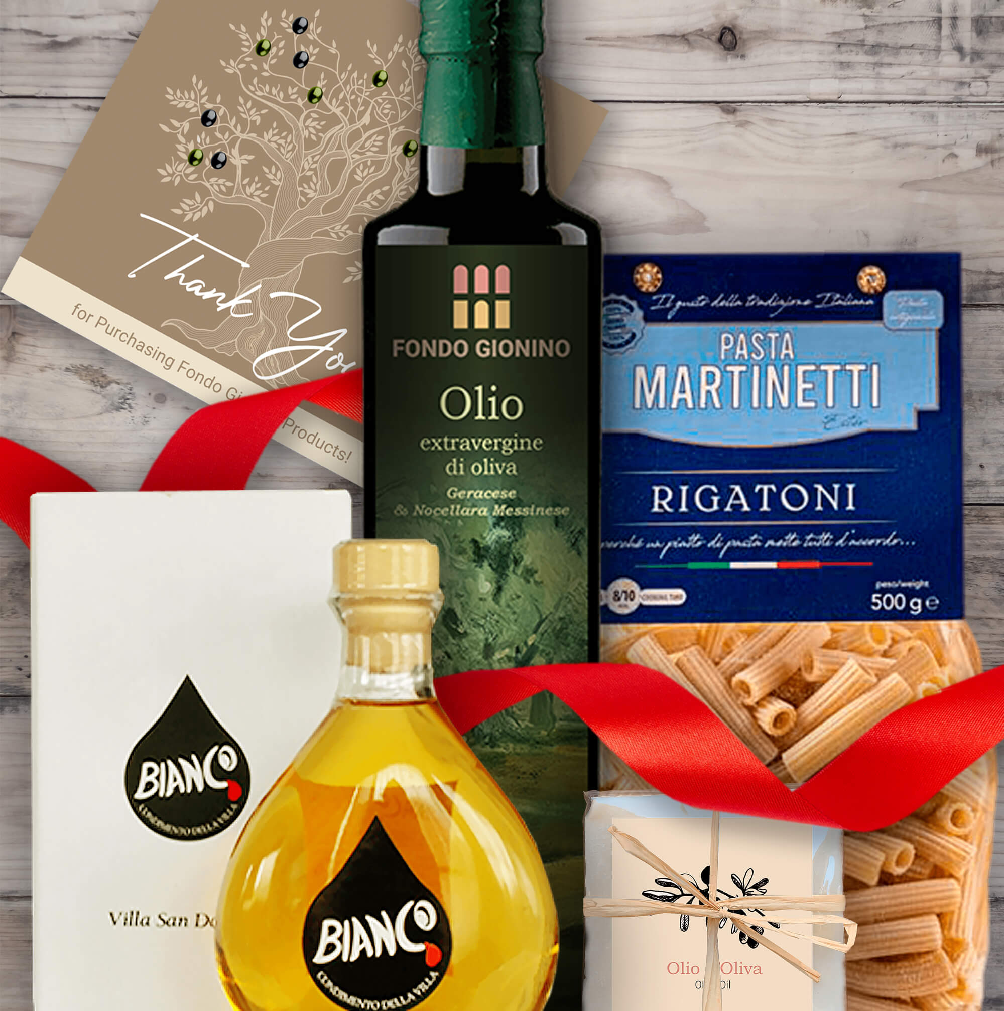Fondo Gionino Geracese & Nocellara Messinese olive oil (500 ml/16.9 fl.oz.), Martinetti Rigatoni pasta, Balsamic Vinegar Villa San Donnino Bianco - aged 2 years (200 ml), and a handmade Soap Olive Oil (100 gr/3.5 oz)